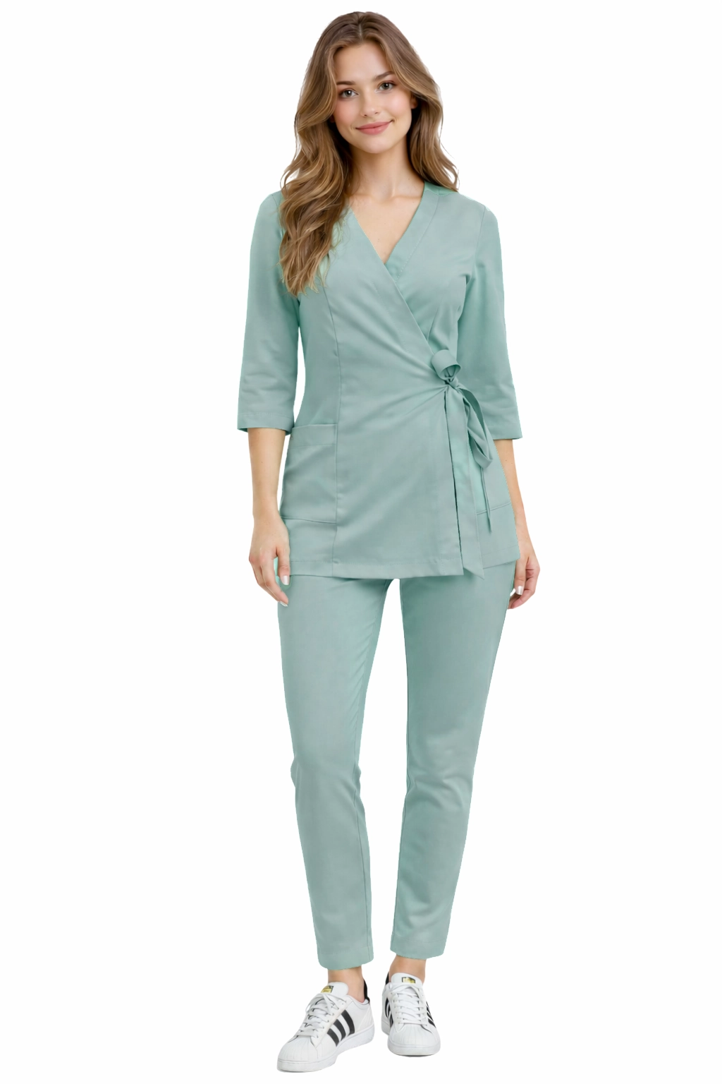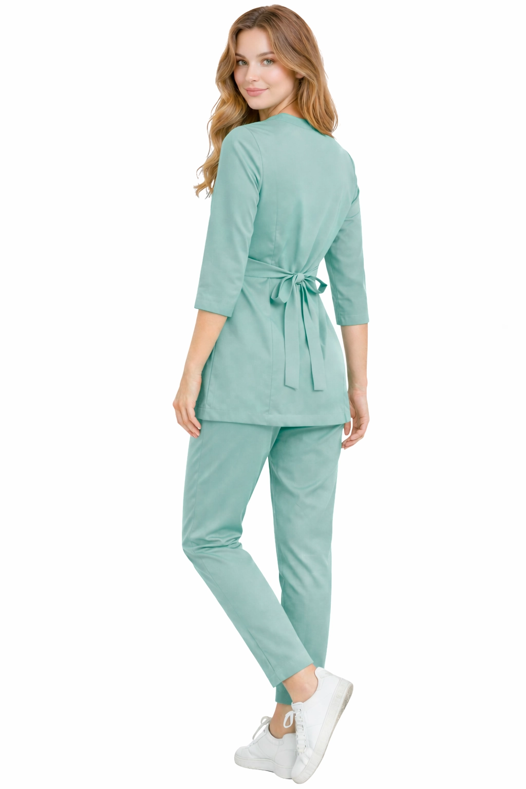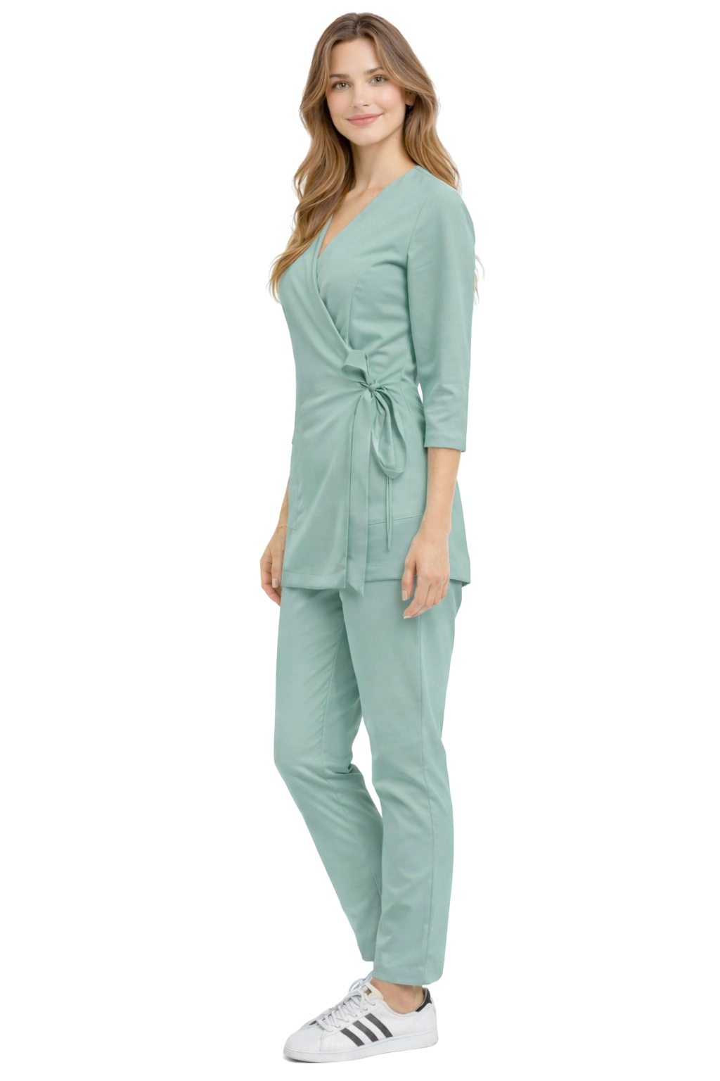 The set includes a stylish crossover tunic with 3/4 sleeves and comfortable, modernly cut medical trousers. An ideal choice for those who value aesthetics and comfort in everyday uniforms.