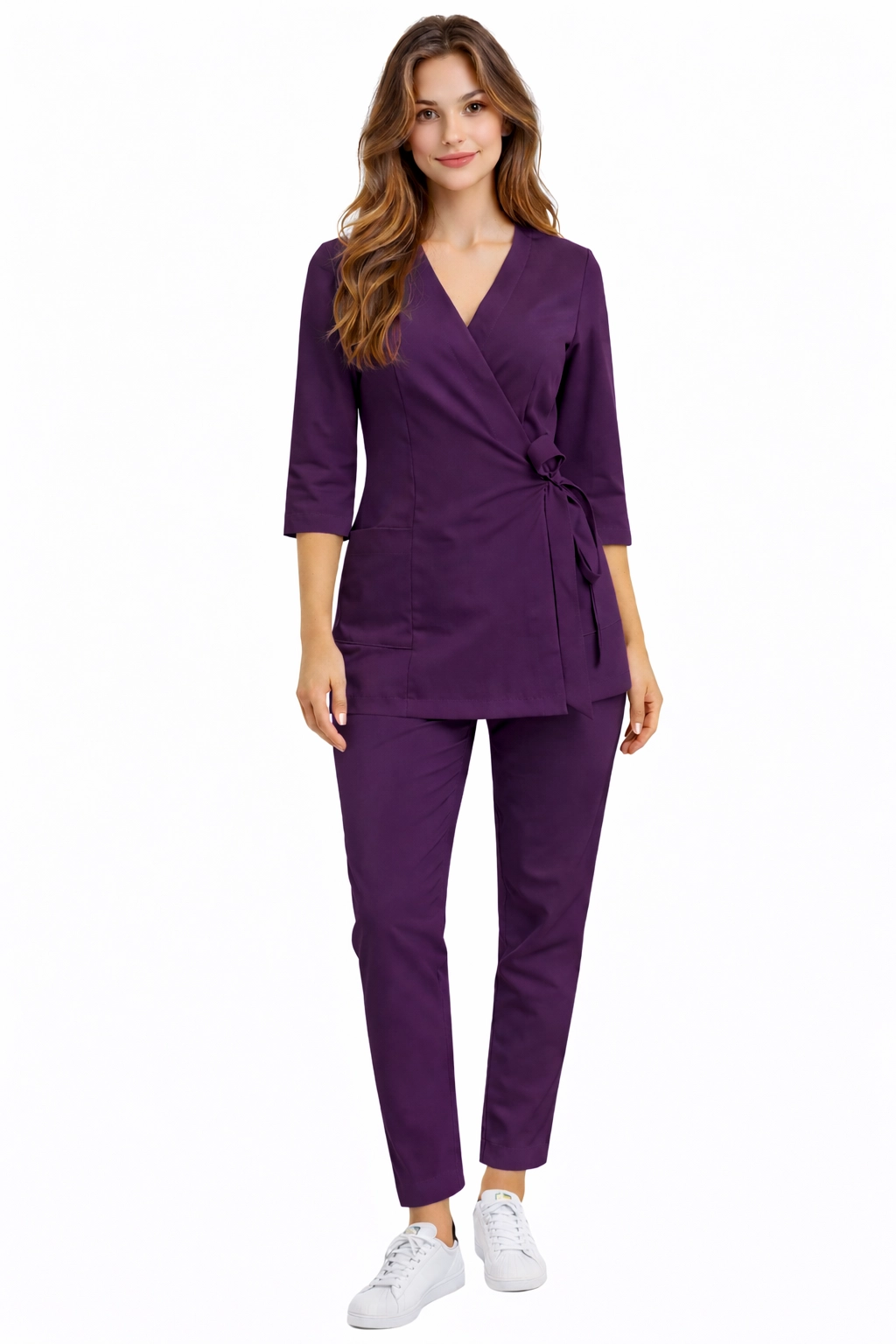 Discover the elegance and comfort of wearing with our women's medical wrap tunic BASIC PREMIUM in a shade of purple. With 3/4 sleeves, this tunic combines modern design with functionality, perfectly proving itself in everyday work in the health service. Made of high quality materials, it ensures comfort and freedom of movement, which is extremely important in medical professions. A stylish color gives it a unique character, and a wrap cut emphasizes the silhouette.