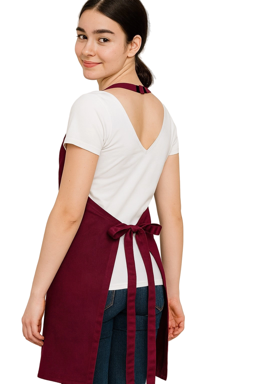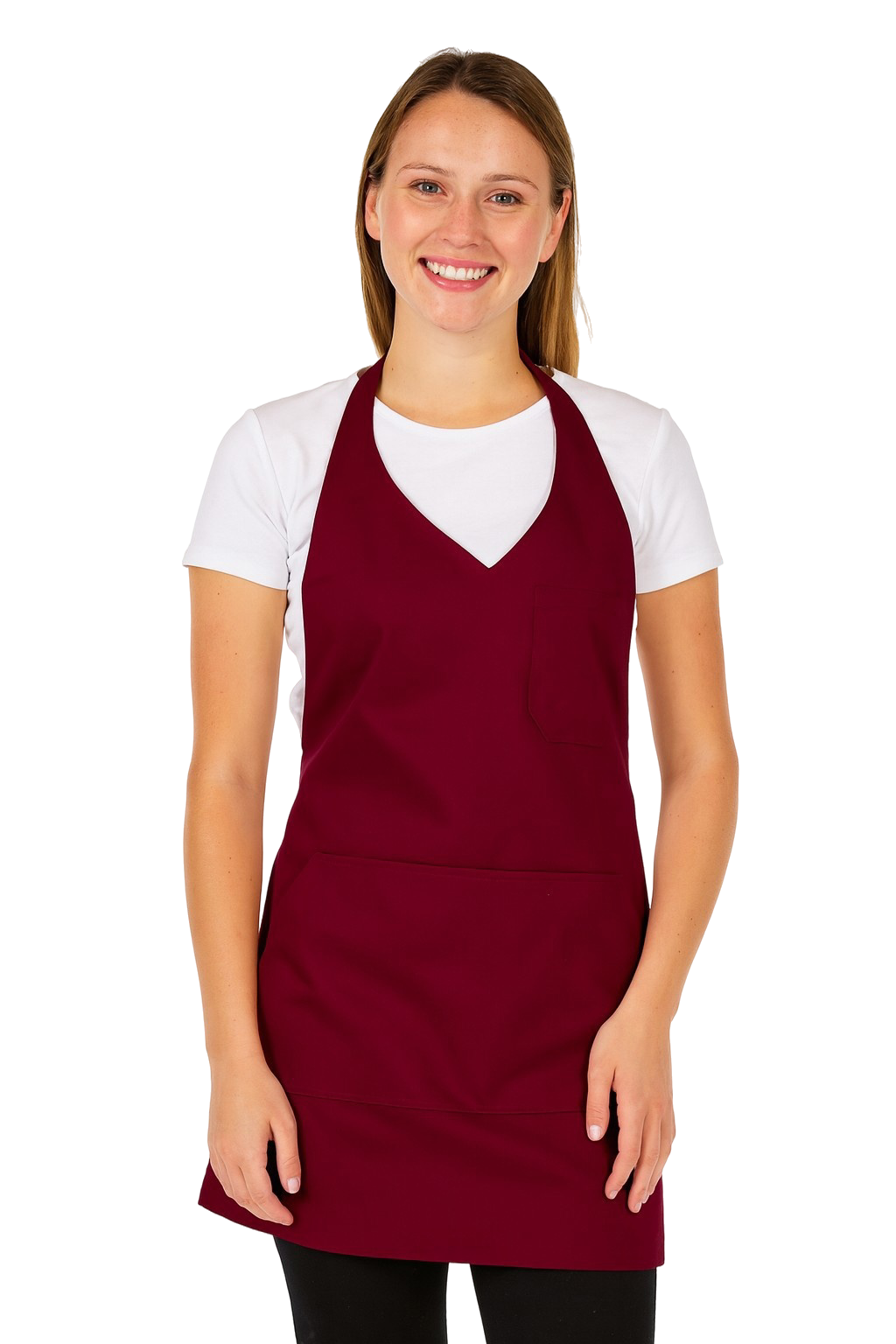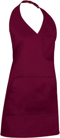 The apron is made of a blend of 65% polyester and 35% cotton, which ensures resistance to damage, frequent washing, and maintaining the intense burgundy colour. The high weight of 210 g/m² makes the material durable while being comfortable to wear. Thanks to the adjustable buckle on the straps and tying at the back, the apron can easily be adjusted to fit any figure.