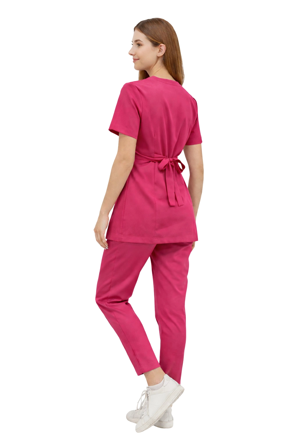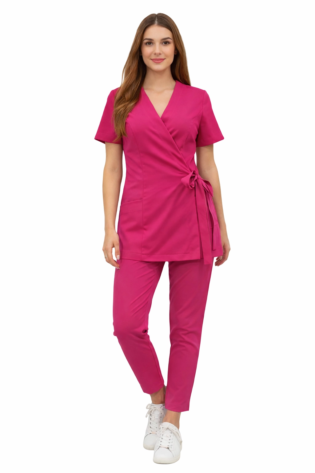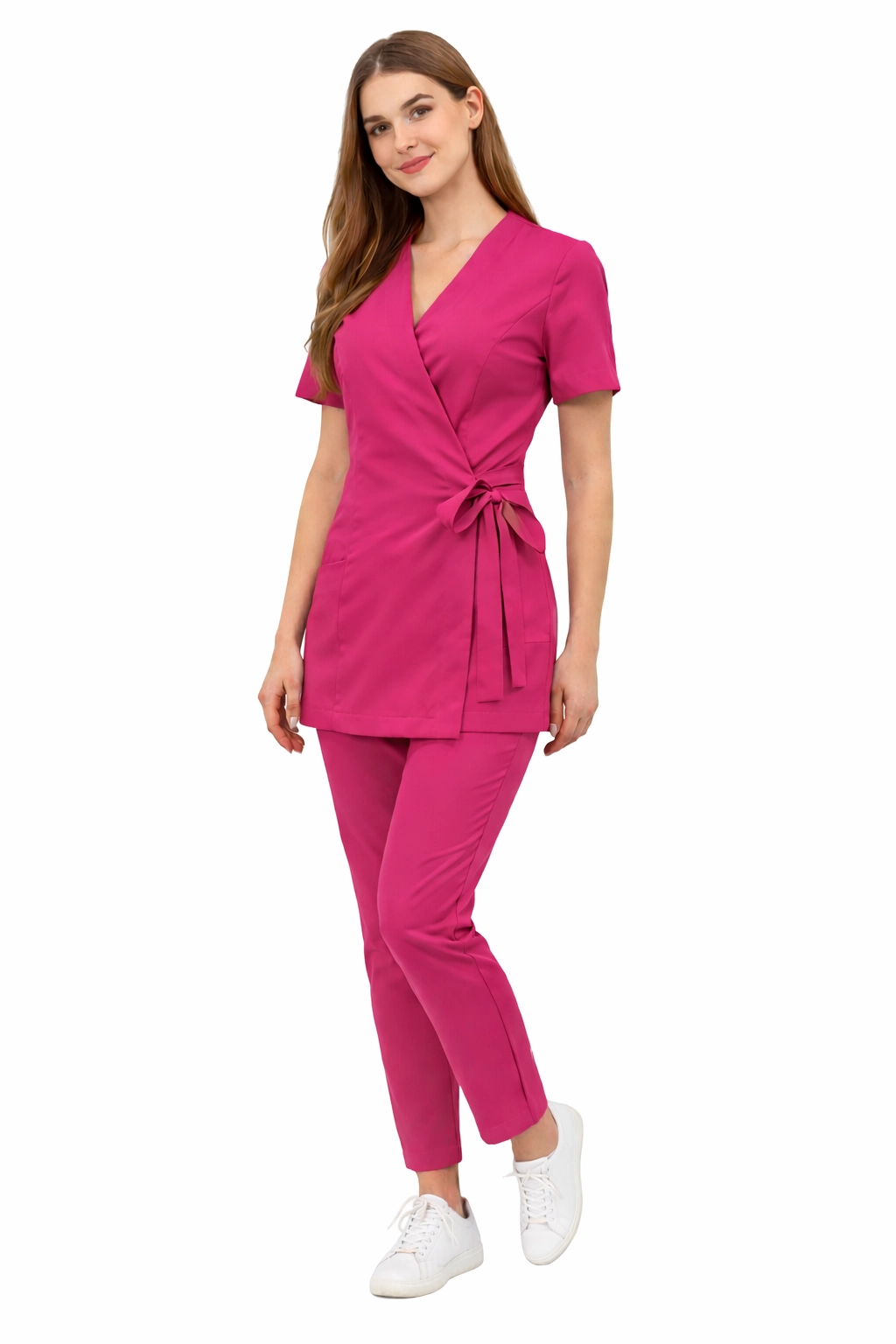 The Basic Premium set is a combination of elegance, functionality, and comfort – designed with women working in the medical, cosmetic, and wellness sectors in mind. It consists of a wrap-around jacket (tunic) and Basic Premium trousers, creating a cohesive, stylish medical uniform.