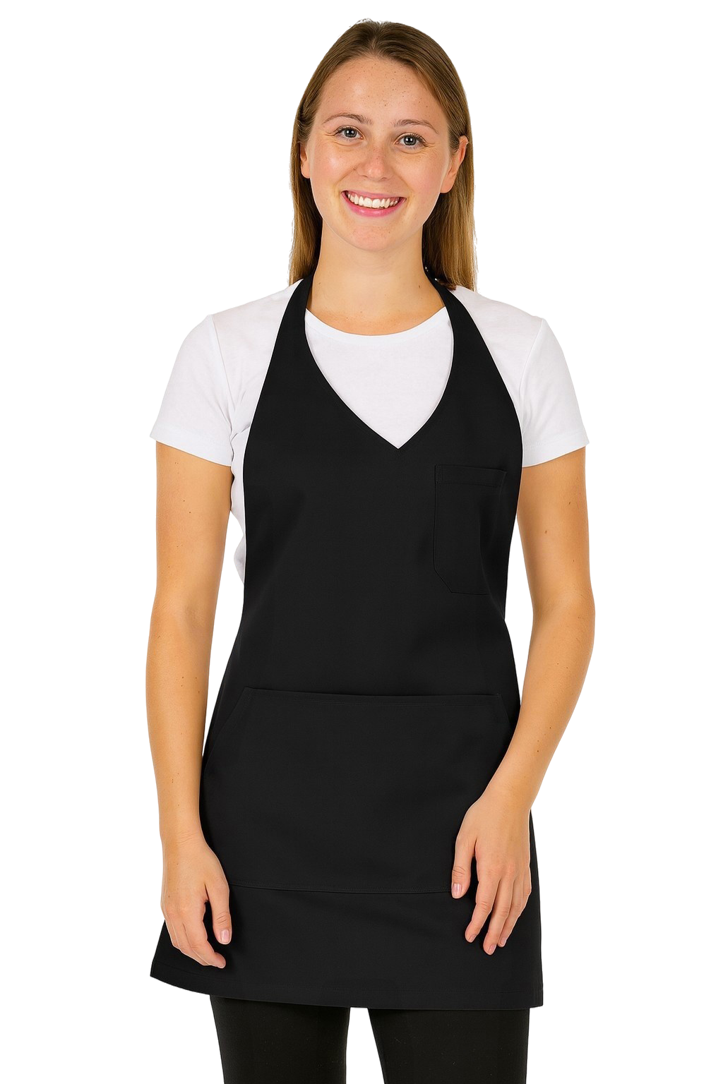 The apron is made from a blend of 65% polyester and 35% cotton, which guarantees resistance to damage, frequent washing, and keeping the intense black colour. The high grammage of 210 g/m² ensures that the material is robust, yet comfortable to wear. Thanks to the adjustable clip on the straps and the tie-back, the apron can be easily adjusted to any body shape.