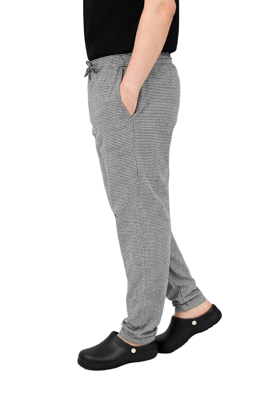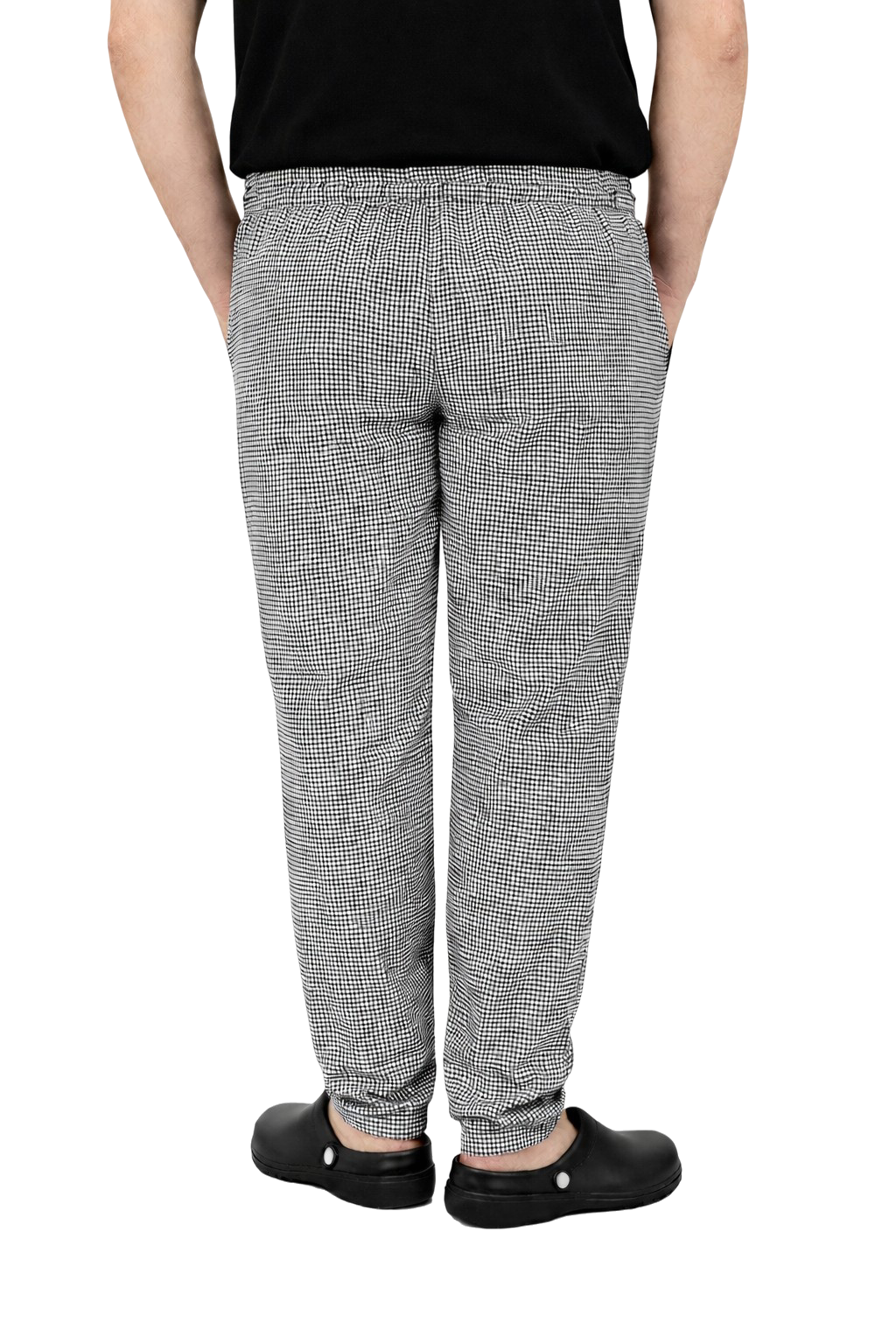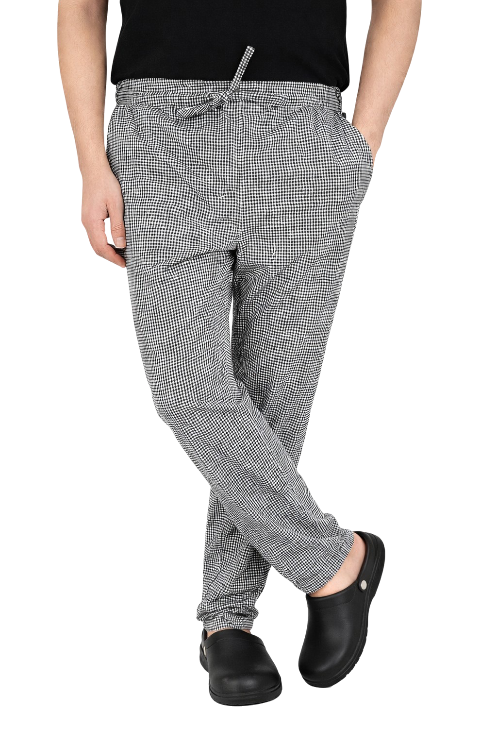 The comfortable chef trousers in a fine black and white check is a very popular chef clothing model, it goes well with both white and black chef blouses. The classic colour scheme is an asset and makes this one of the most popular designs. The chef trousers are a basic item of catering clothing. The trousers have practical two pockets and an adjustable waistband with elastic band. High-quality material makes the trousers comfortable to wear. The trousers' legs are tapered towards the bottom, giving them a unique character and modern look.