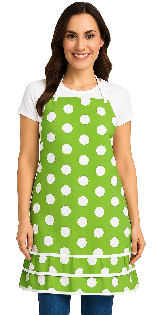 Stylish green kitchen apron with white polka dots for adults