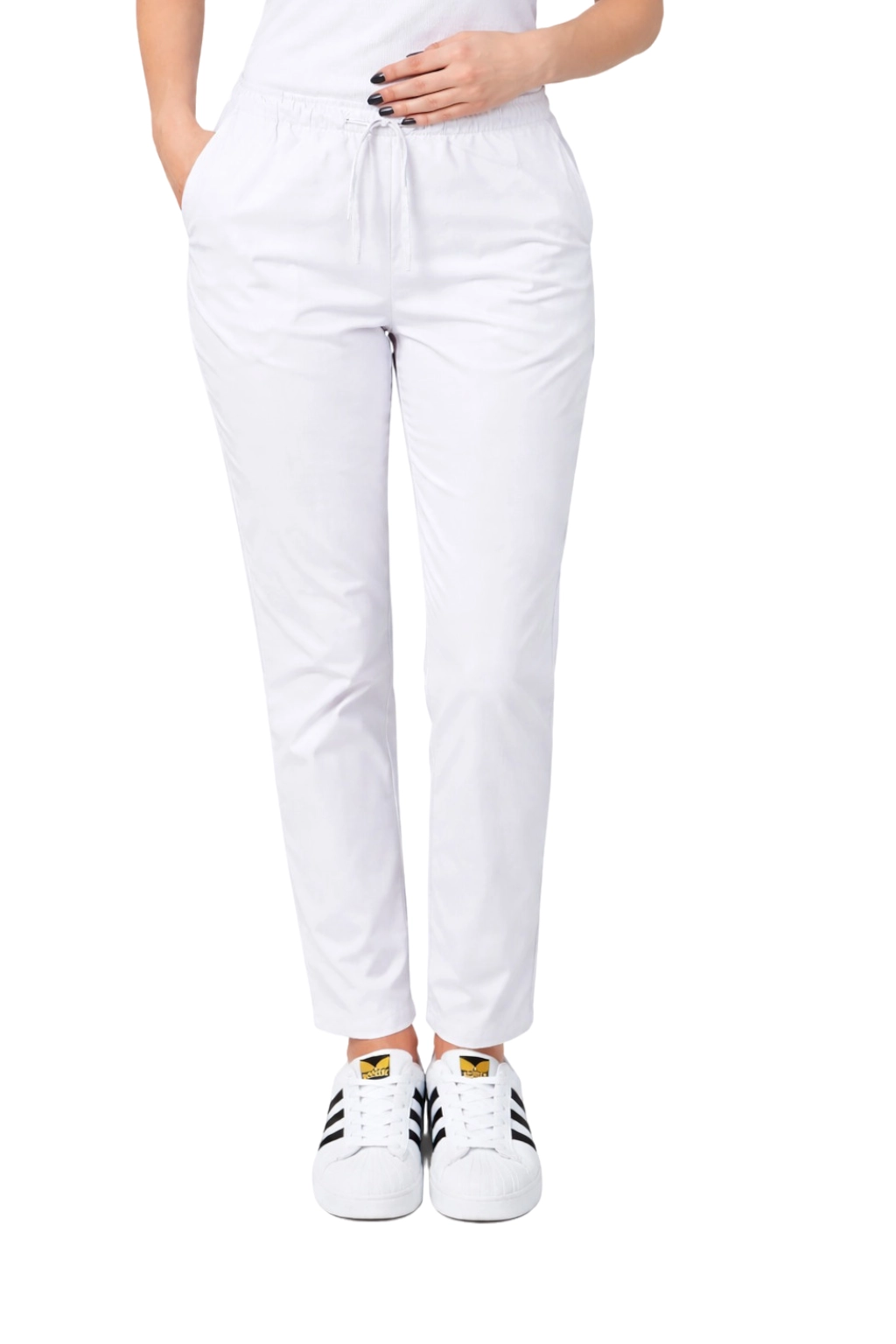 The model is distinguished by its slightly tapered legs and a waistband with a drawstring, which ensure a perfect fit and freedom of movement. Two practical side pockets allow for storing the most necessary accessories - from pens to small medical equipment. The universal white colour makes the trousers pair well with colourful medical blouses, allowing you to create coherent and modern sets.